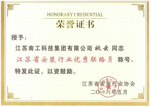 2016年5月13日,江苏省安装行业协会2016年度联络员与通讯员暨办公室主任工作会议在南京凤凰环球星程酒店隆重召开。集团行政人事部姚云获得优秀联络员称号。