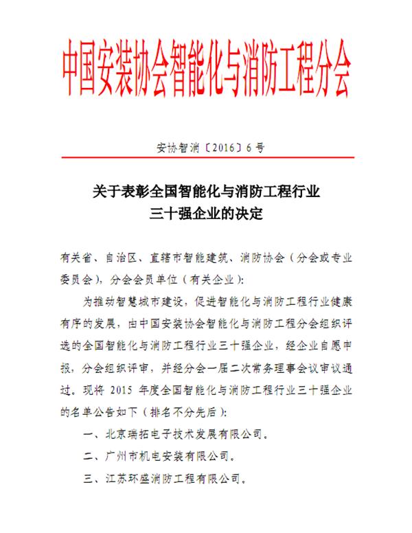 2016年9月23日,由中国安装协会智能化与消防工程分会组织评选的“全国智能化与消防工程行业三十强”企业名单正式公布,集团荣获了“全国智能化与消防工程行业三十强”企业的殊荣。