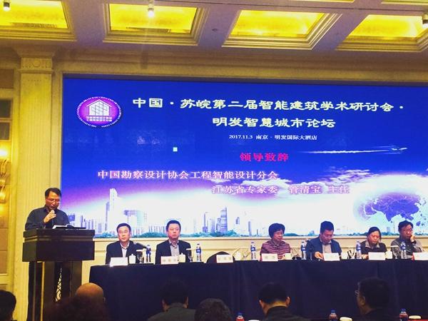 2017年11月3日,中国·苏皖第二届智能建筑学术研讨会明发智慧城市论坛在南京明发国际大酒店召开。参加研讨会的嘉宾有中国勘察设计协会智能设计工程分会会长胡萍,《数据中心数据规范》标准编写组组长钟景华,中国勘察设计协会智能设计工程分会湖北省专家委员会主任熊江、安徽省专家委员会主任万力、山东省专家委员会主任张钊、江苏省专家委员会主任管清宝,江苏k1体育科技集团有限公司执行董事陈俊桦及集团副总经理吴雪峰等近300多人参加了研讨会。