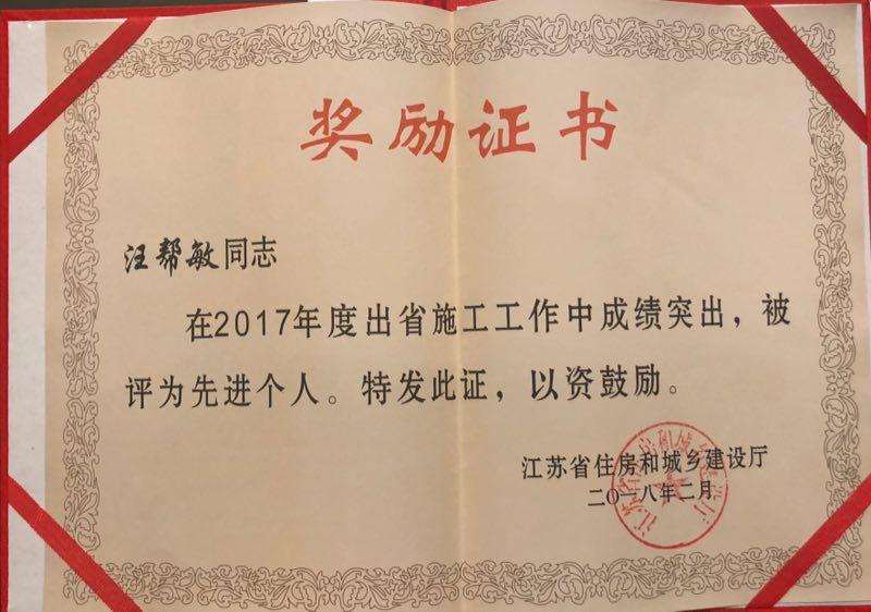 2018年3月25日,江苏省住房和城乡建设厅出省施工企业先进集体和个人西南地区表彰大会在重庆隆重召开。江苏k1体育科技集团有限公司总经理助理兼重庆分公司总经理汪帮敏荣获2017年度出省施工工作“先进个人”称号。