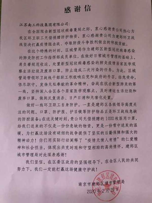 2020年2月29日,集团执行董事陈俊桦代表公司为南京市建邺区环卫战线无偿捐赠1000枚医用口罩。