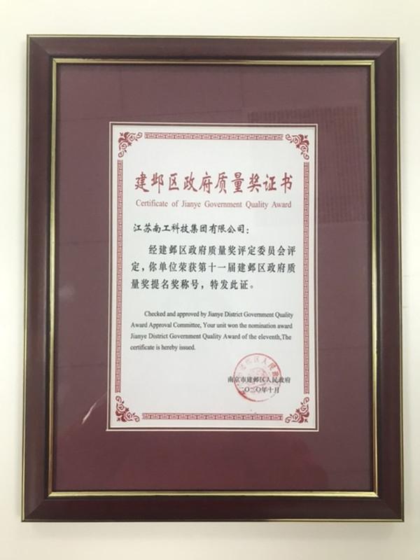 建邺区政府质量奖证书