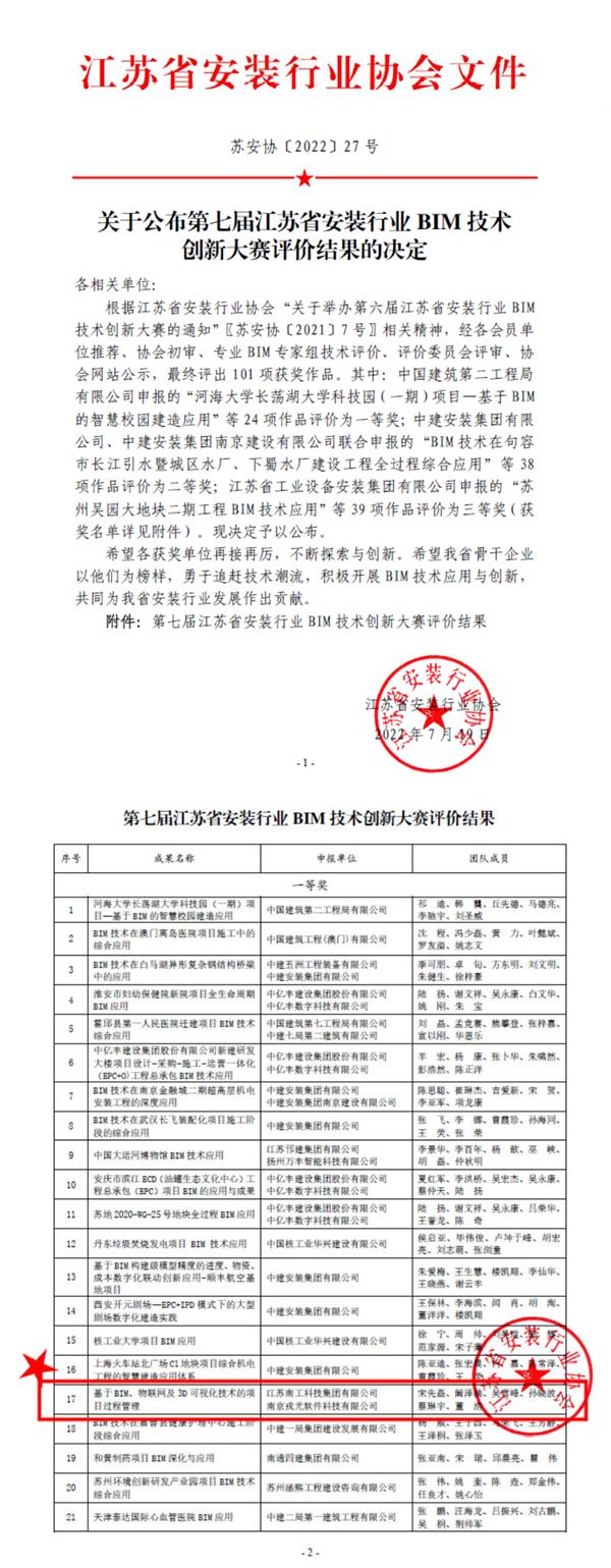 在2022年江苏省安装行业协会组织的第七届BIM大赛中,k1体育集团“基于BIM、物联网、3D技术的项目过程管理”荣获了一等奖。该项荣誉的获得,是k1体育集团一直在BIM技术上持续深耕和深度应用的结果。