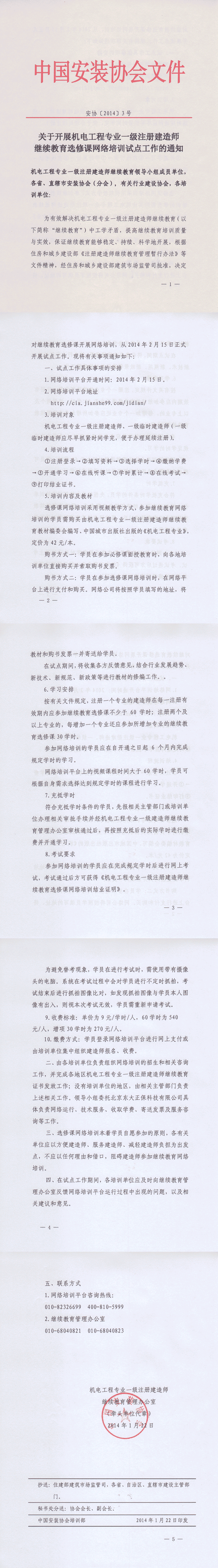 关于开展机电工程专业一级注册建造师继续教育选修课网络培训试点工作的通知
